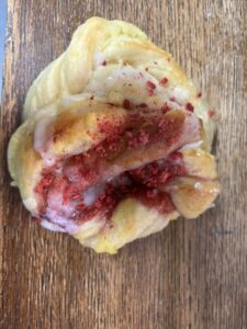 Vaniljesnurr med bjørnebærfyll toppet med valnøtt.