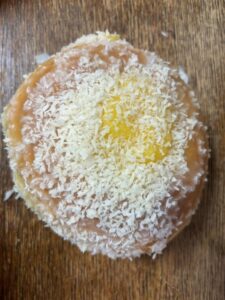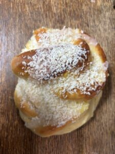 Deilig vaniljesnurr med vaniljekrem snurret inni bollen. Kokos på toppen.